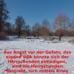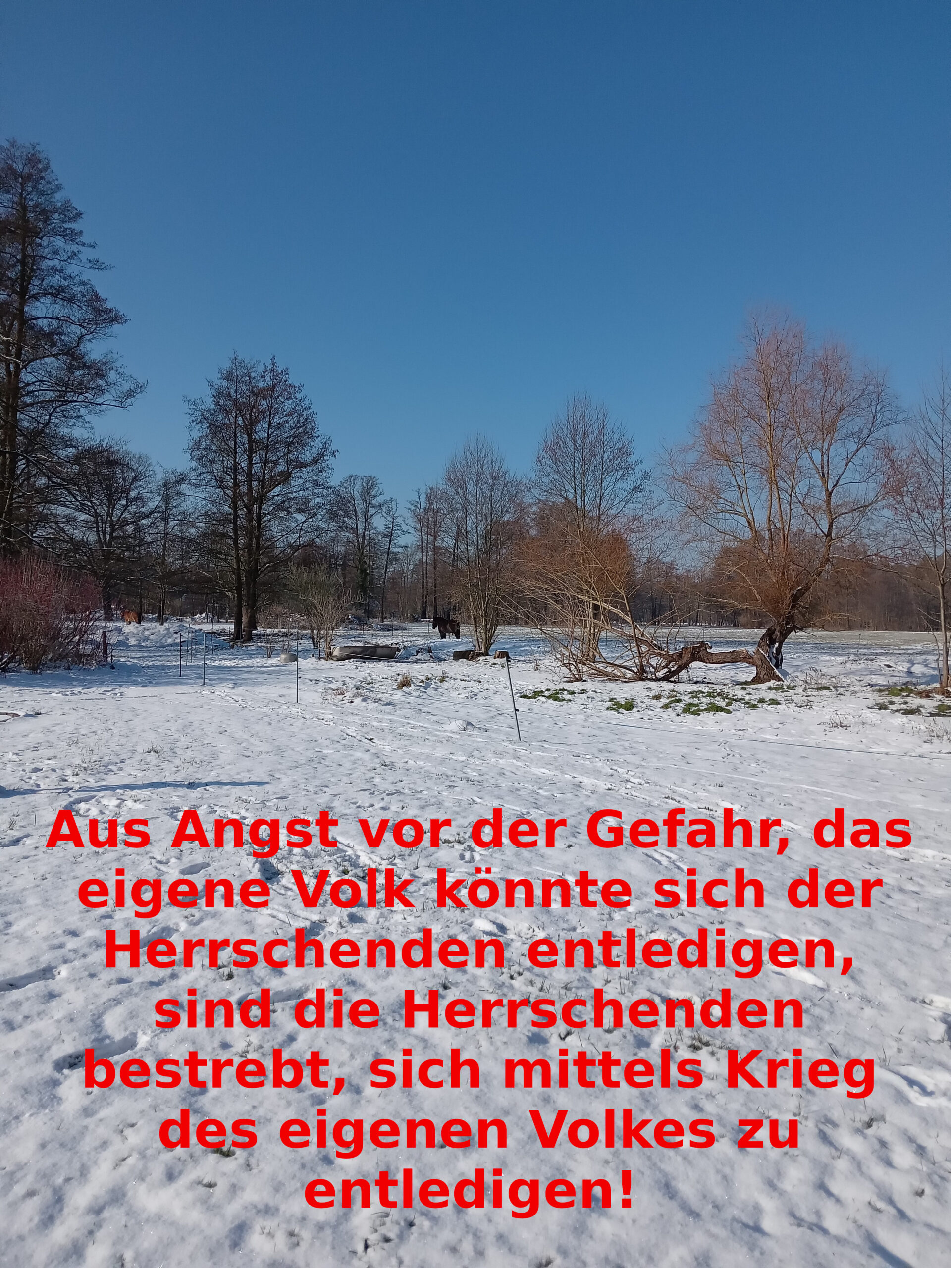 Allerdings haben alle Ängste ein Verfallsdatum, sie funktionieren nicht lange und so wird es notwendig immer neue Ängste zu kreieren. In der jüngeren Vergangenheit war es zum Beispiel das Ozonloch, wo ist es geblieben, heute redet niemand mehr darüber, dann wurde der Klimawandel zum Maßstab einer Apokalypse erhoben und auch ein Virus wurde bemüht, den Menschen Angst und Schrecken einzureden. Nun sind es kriegerische Ambitionen, welche Ängste zeugen, allen eint eine Bedrohung, welche für die Menschen existenziell sein soll und wenn den Vorgaben der Herrschenden nicht gefolgt, ist der Untergang gewisse!